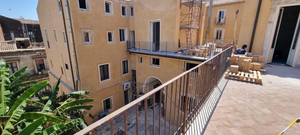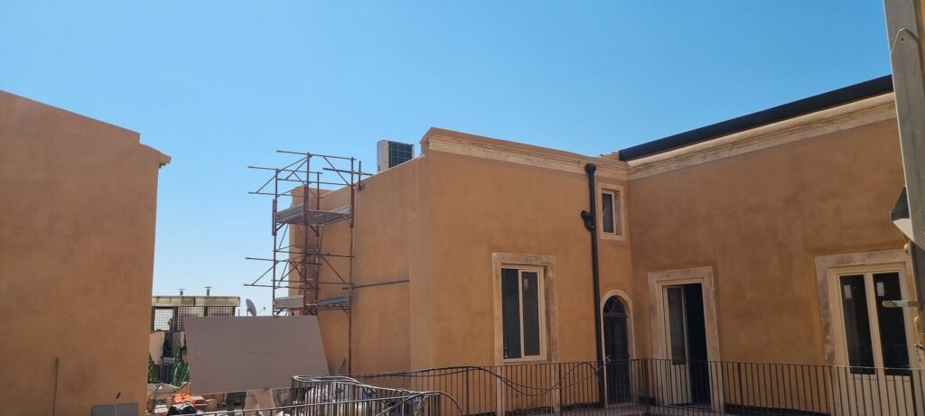 The structural work was developed in synergy with the energy efficiency measures, these on a project by Studio Stancanelli Russo Associati s.r.l., with the collaboration of engineer Melita Pennisi. Thus, while taking care of the roof, we also provided for its insulation, and we also changed most of the existing window and door frames, replacing them with oak and douglas wooden frames, in colours in keeping with the historical context. In addition to these modernisation measures, designed to make the building more sustainable, we also added the use of thermo-plaster applied to the non-main façades (those not affected by the historical constraint) and the adaptation of the thermal systems, with the installation of heat pumps. Thanks to these interventions, the building’s energy efficiency has been increased by two classes. Furthermore, what characterised this project was the respect for the historical memory of traditional building and restoration, between innovation and tradition. Under the supervision of the Soprintendenza per i Beni Culturali, which suggested the techniques to be used, we restored both the stone and the plaster of the facades on Via Crociferi and Via Alessi. For the new plaster, given its important historical value, we have maintained the difference in colour between the main and secondary streets. In fact, it was common practice at the time to use a more refined plaster, similar to stucco and highly worked, on the façade of the main street and instead cocciopesto, an unrefined plaster, on the secondary streets. We have maintained this characteristic, using a plaster with a final glaze on Via Crociferi and cocciopesto for the other areas. Thanks to our restoration work, the building once again has two traditionally different colours, with two different but similar glazes to keep the logic of the period intact.