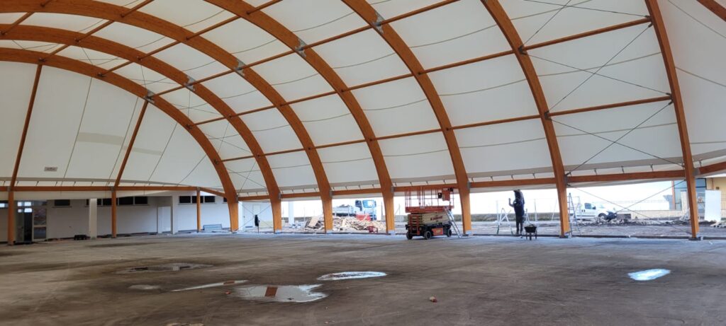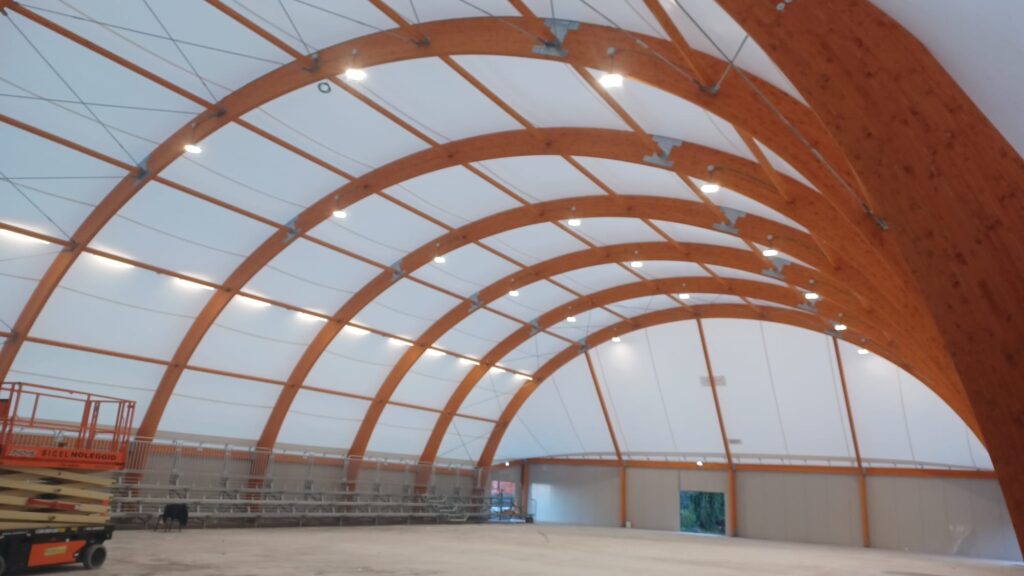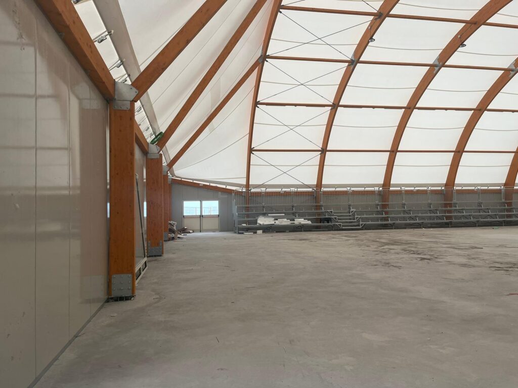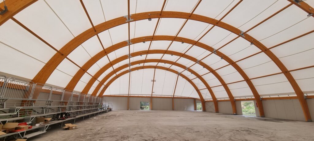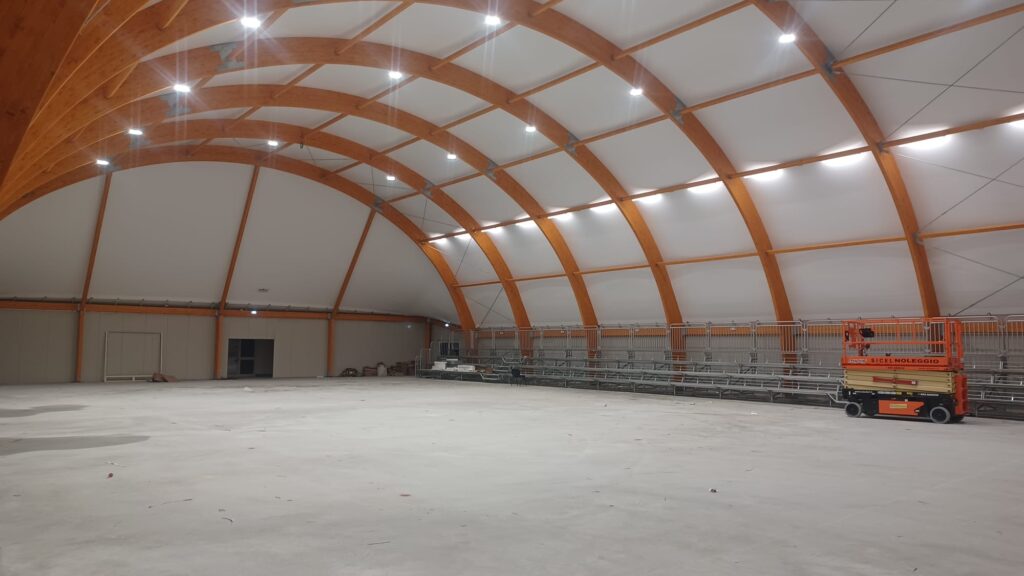 L’utilisation de la technologie BIM dans la phase de conception a permis de garantir un haut degré de précision de la conception et de la construction, ainsi qu’une interopérabilité constante entre les différentes disciplines impliquées. L’ouvrage, conçu et réalisé conformément à la réglementation en vigueur en matière d’installations sportives, et notamment aux normes C.O.N.I. relatives aux installations sportives, se compose d’une structure en lamellé-collé, d’un sol sportif en PVC équipé d’un vide sanitaire aéré, et de tribunes modulaires en acier.