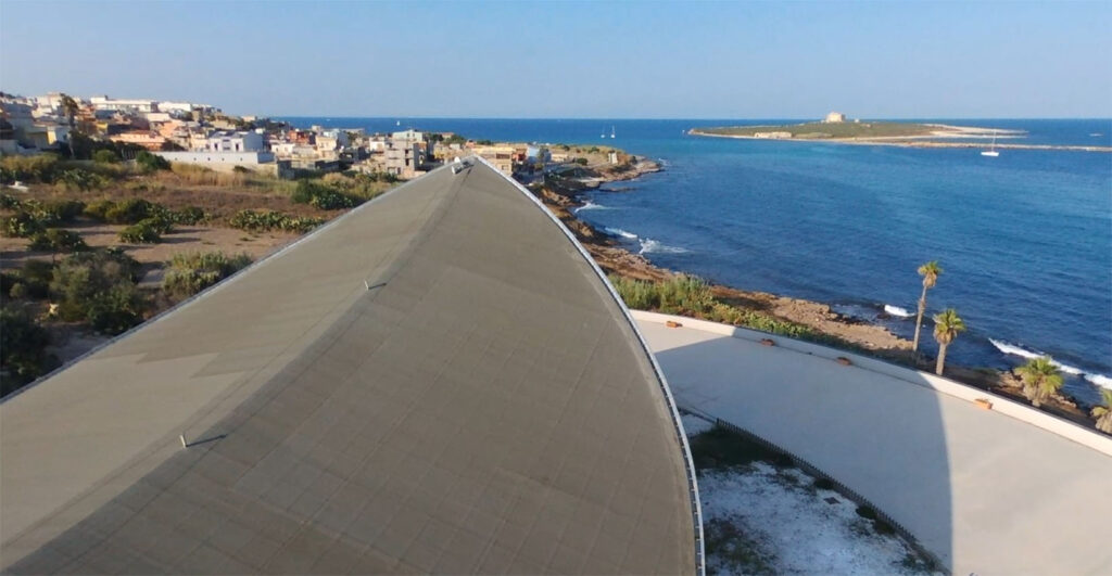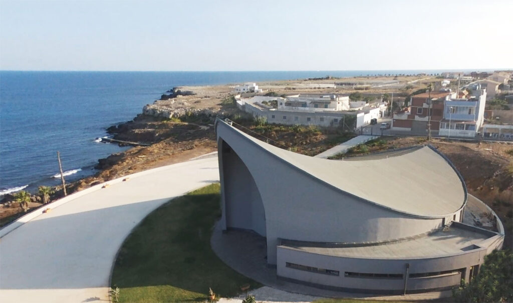 Aux deux extrémités de l’édifice cultuel se trouvent deux grandes niches sous d’élégants arcs brisés, l’une formant un narthex d’entrée et l’autre une abside. Ce dernier arc donne sur la mer Ionienne et l’île de Capo Passero, accueillant la lumière à travers une fente cruciforme. Sur le côté de l’église, comme un corps accompagnant le mouvement organique des murs, se trouve la sacristie, avec un toit plat.