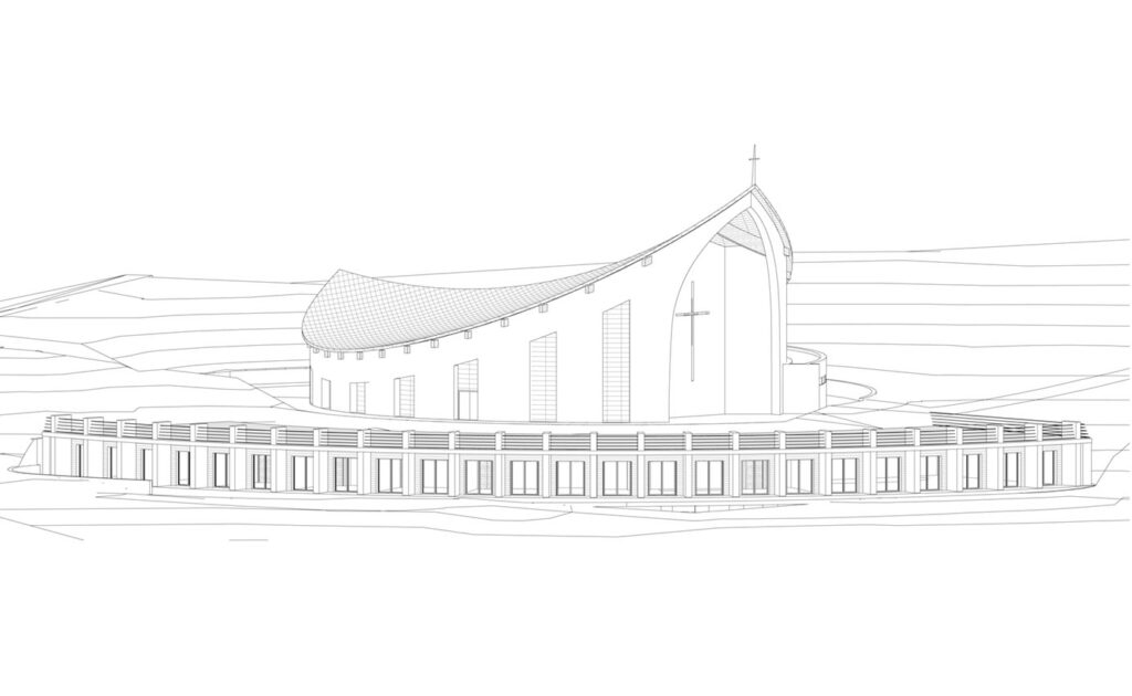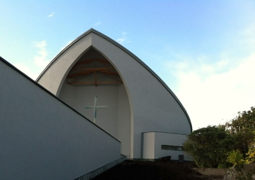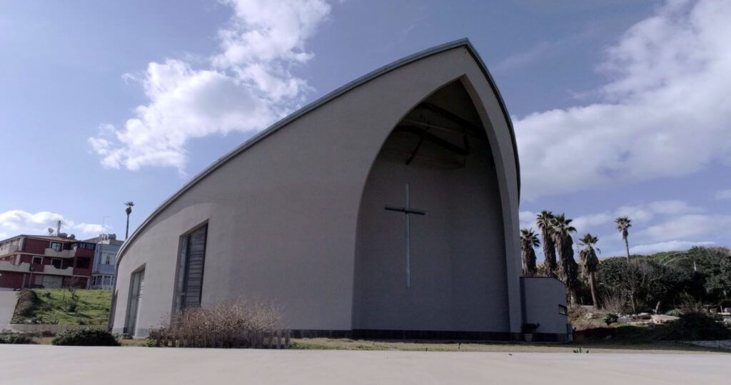 Le complexe se développe à quelques mètres de la mer, sur une partie de la falaise qui descend vers le rivage. La pente actuelle a été utilisée pour obtenir les locaux de la pastorale, c’est-à-dire les salles de classe et le hall. Cela a permis de créer une grande place plane et organique au centre de laquelle se trouve l’église proprement dite.