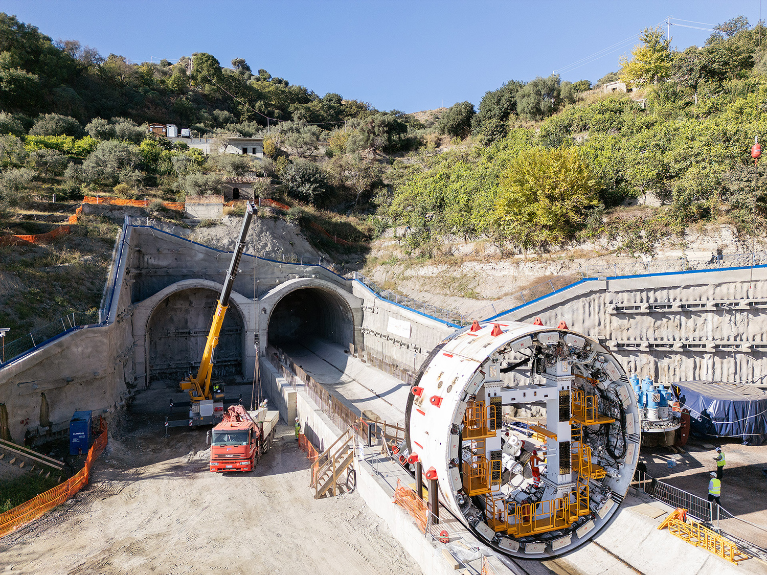 Opérations sur le chantier. Construction réservoirs de déblais, positionnement du tunnelier.