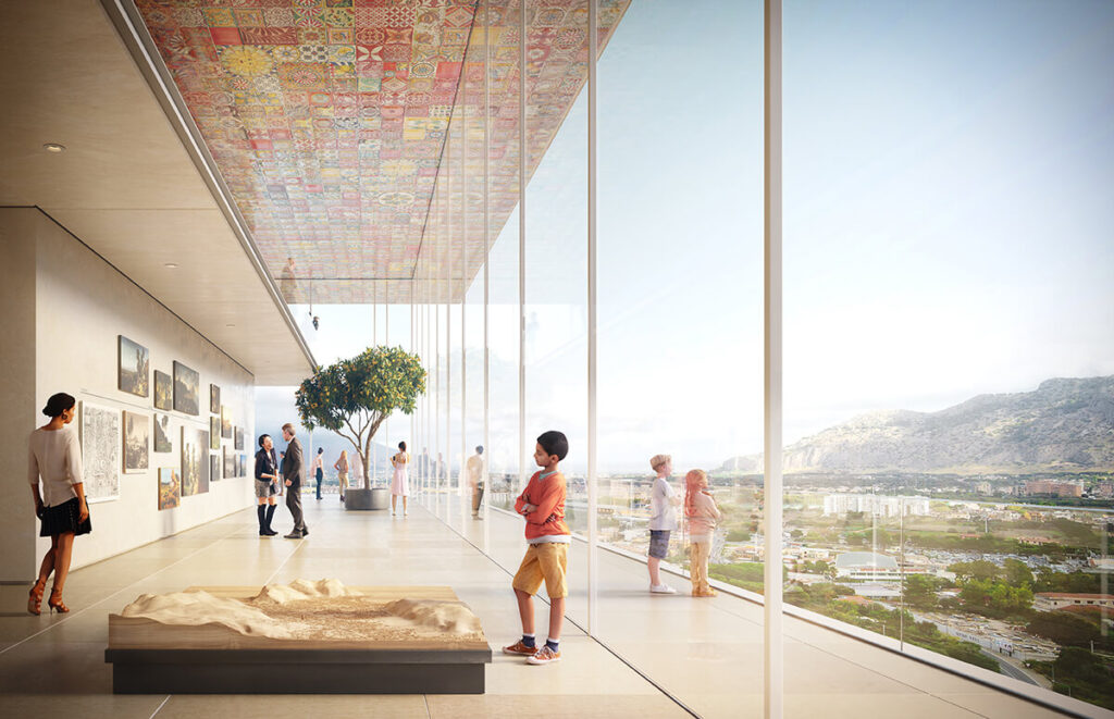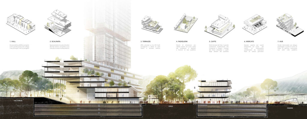 La torre, composta da 10 compartimenti formati da tre livelli, avrebbe accolto gli uffici e sarebbe stata intervallata da tre livelli ristretti, pensati per ospitare la mensa e un museo di storia naturalistica siciliana. Il podio invece avrebbe ospitato ulteriori dipartimenti e una hall accessibile anche al pubblico, con attività commerciali, fitness, ristorazione e centro congressi. A completare la struttura, l’hub sarebbe stato luogo pubblico di incontro, scambio e servizi, con strutture scolastiche, uffici comunali, sale convegni, guardia medica e biblioteca. Al piano terra un grande spazio avrebbe permesso anche l’installazione di un mercato coperto.